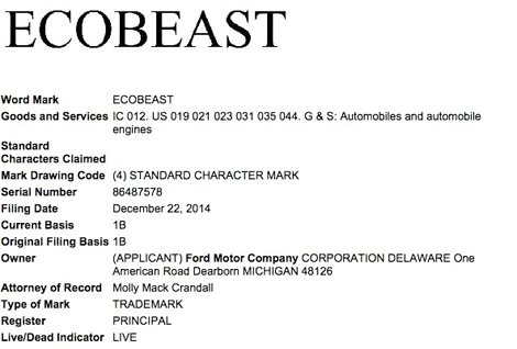 Патент от 22 декабря 2014 года, выданный Ford на торговую марку EcoBeast в категории "автомобили и двигатели"